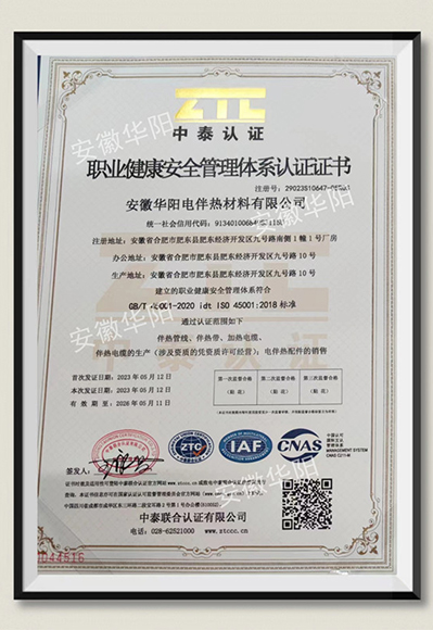 安徽华阳电伴热材料有限公司荣获ISO45001职业健康安全管理体系认证证书,这标志着我司已经达到了全球认可的国际标准要求。这一证书的签发,是对我司一贯以来十分看重的安全生产工作的最好肯定和认可。 IS...
